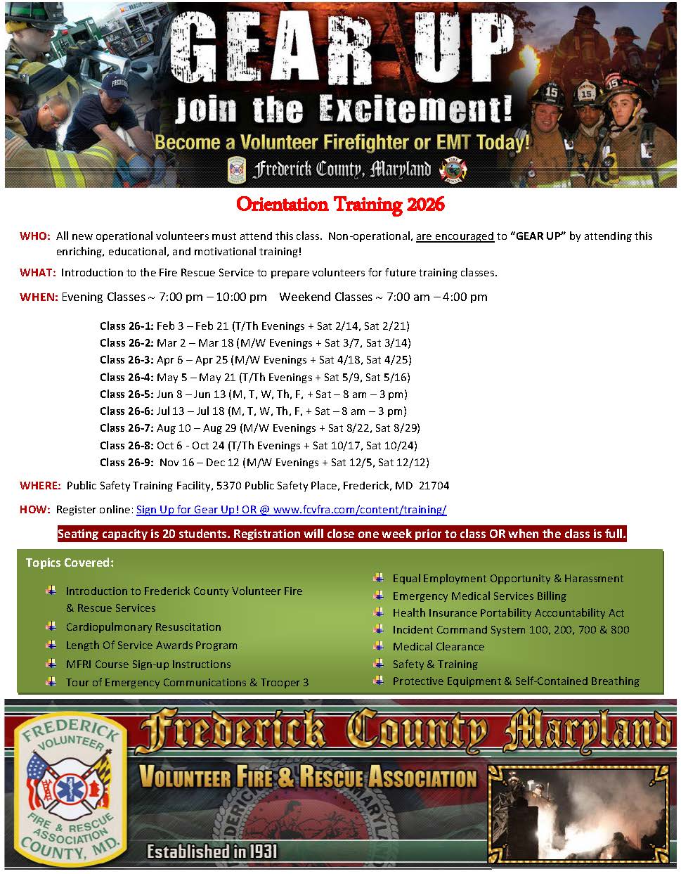 • Current membership in good standing with a volunteer corporation OR employment as a firefighter with Frederick County Government
